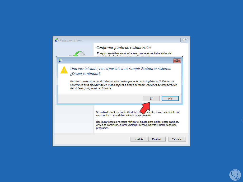 Allí damos clic en Sí para que se inicie todo el proceso de restauración del sistema.