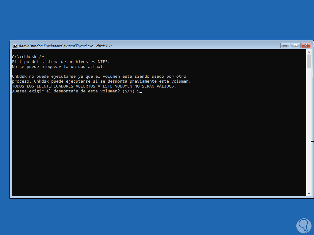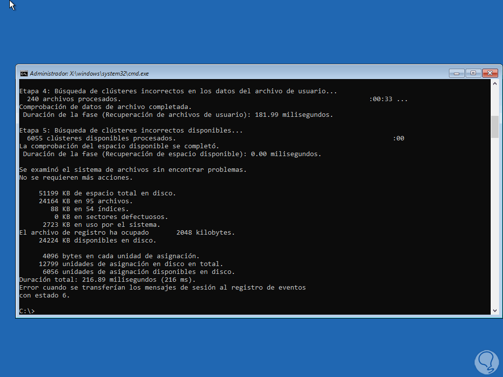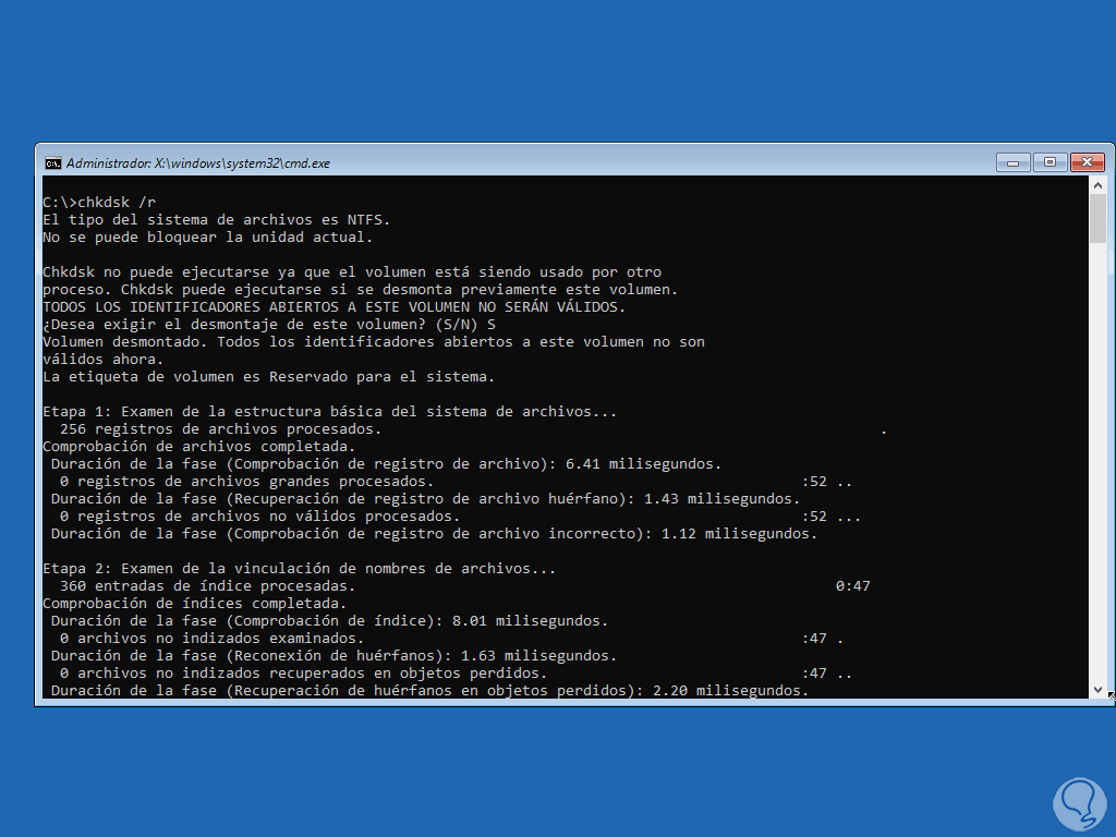 Después de esto vamos a ejecutar un análisis al sistema de archivos NTFS con el siguiente comando: