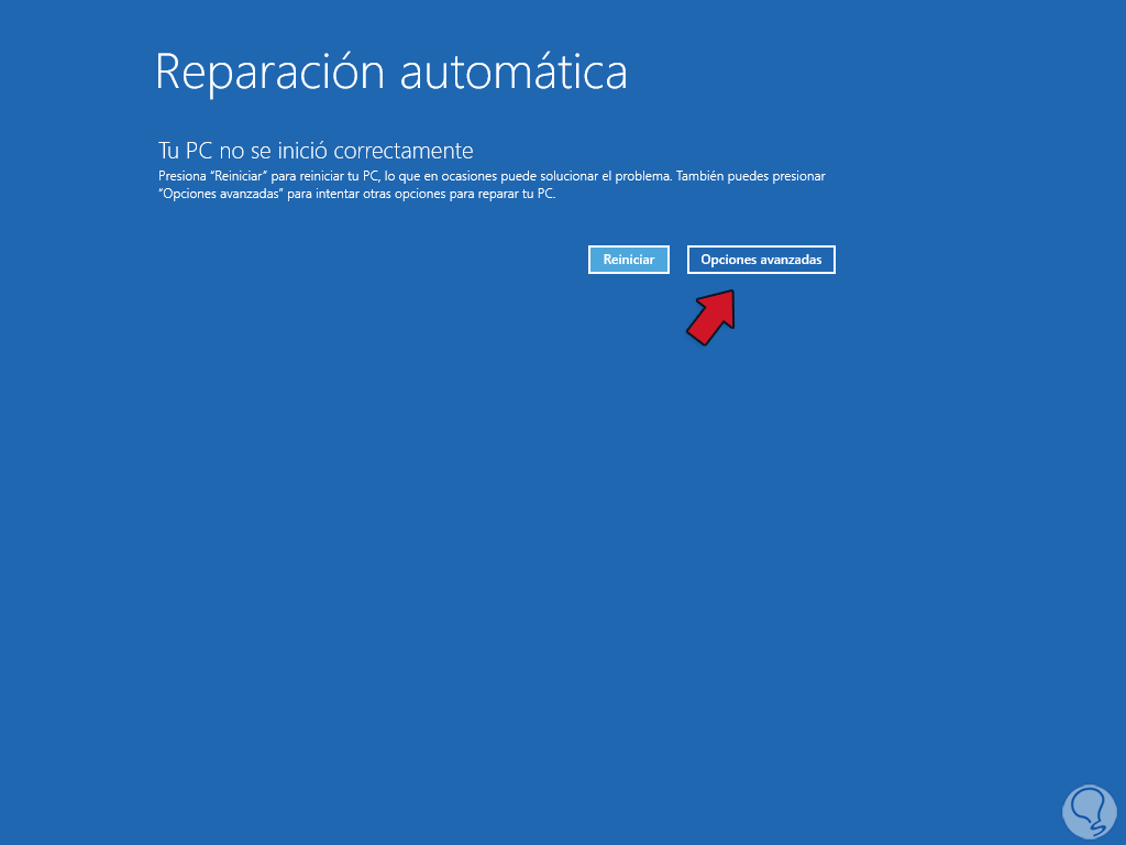 Es normal que veamos que no se logró reparar Windows. Damos clic en "Opciones avanzadas"