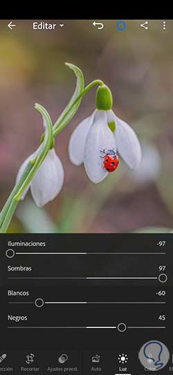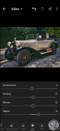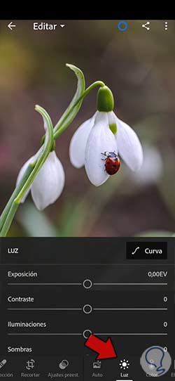 Vamos a comenzar haciendo un ajuste de luz global. Para ello pulsaremos en el apartado de “Luz” desde el panel inferior.