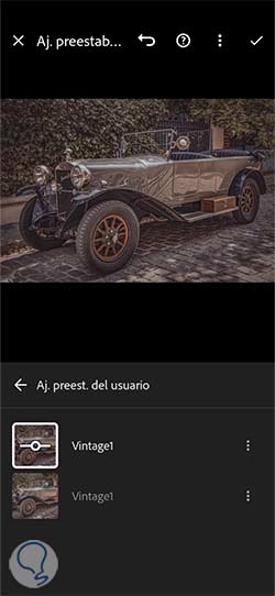 Una vez tengamos nuestro efecto vintage listo vamos a generar un ajuste preestablecido para poder aplicarlo siempre que queramos. Para ello vamos a pulsar sobre los tres puntos superiores: