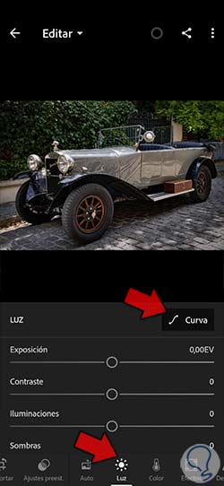 Empezaremos configurando el apartado de “Luz” de nuestra fotografía. Para ello pulsaremos en el apartado inferior de “Luz”.