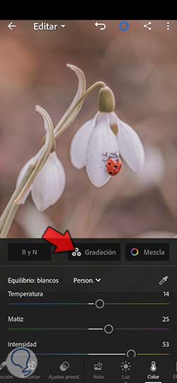 Vamos a seguir configurando el color de nuestra fotografía y para ello vamos a trabajar las iluminaciones y las sombras. Por eso dentro de “Color” pulsaremos sobre “Gradación de color”.