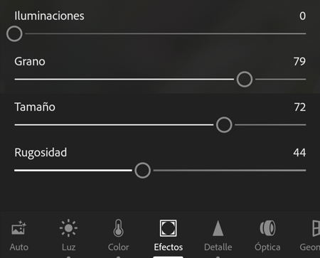Seguiremos editando nuestra fotografía trabajando sobre el apartado de “Efectos”. Aquí aplicaremos una configuración similar a esta. Potencia más el efecto de “Grano” si quieres que se note más el efecto de cámara analógica.