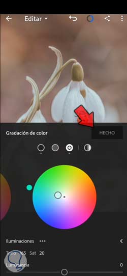 Ahora pulsamos en el icono de “Iluminacionesy con la ruleta de color nos iremos desplazando o haciendo toques en alguna zona cuyos valores se acerquen a: