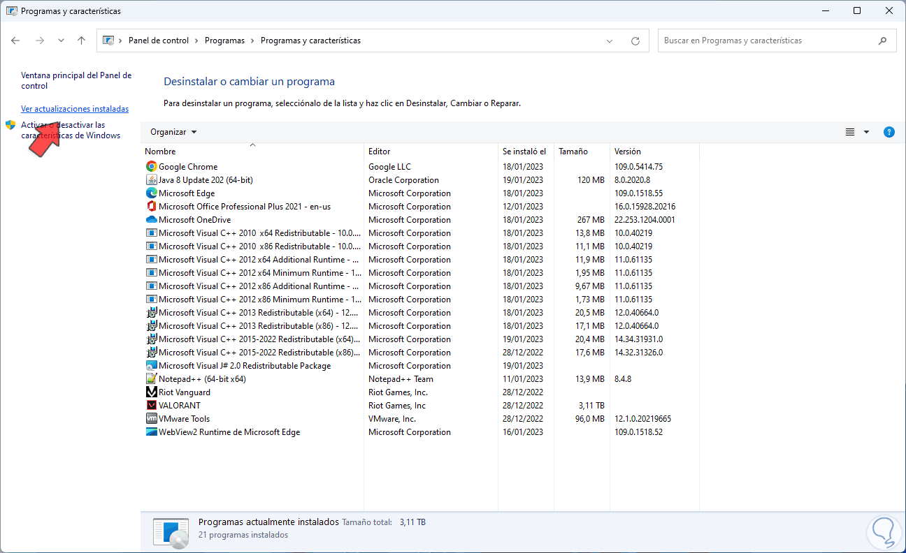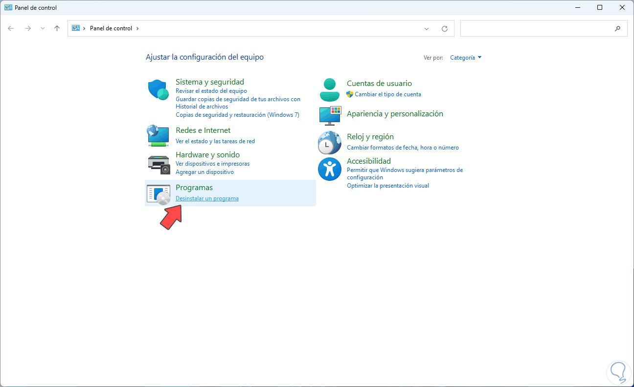 Para ello abrimos el Panel de control y damos clic en "Desinstalar un programa":