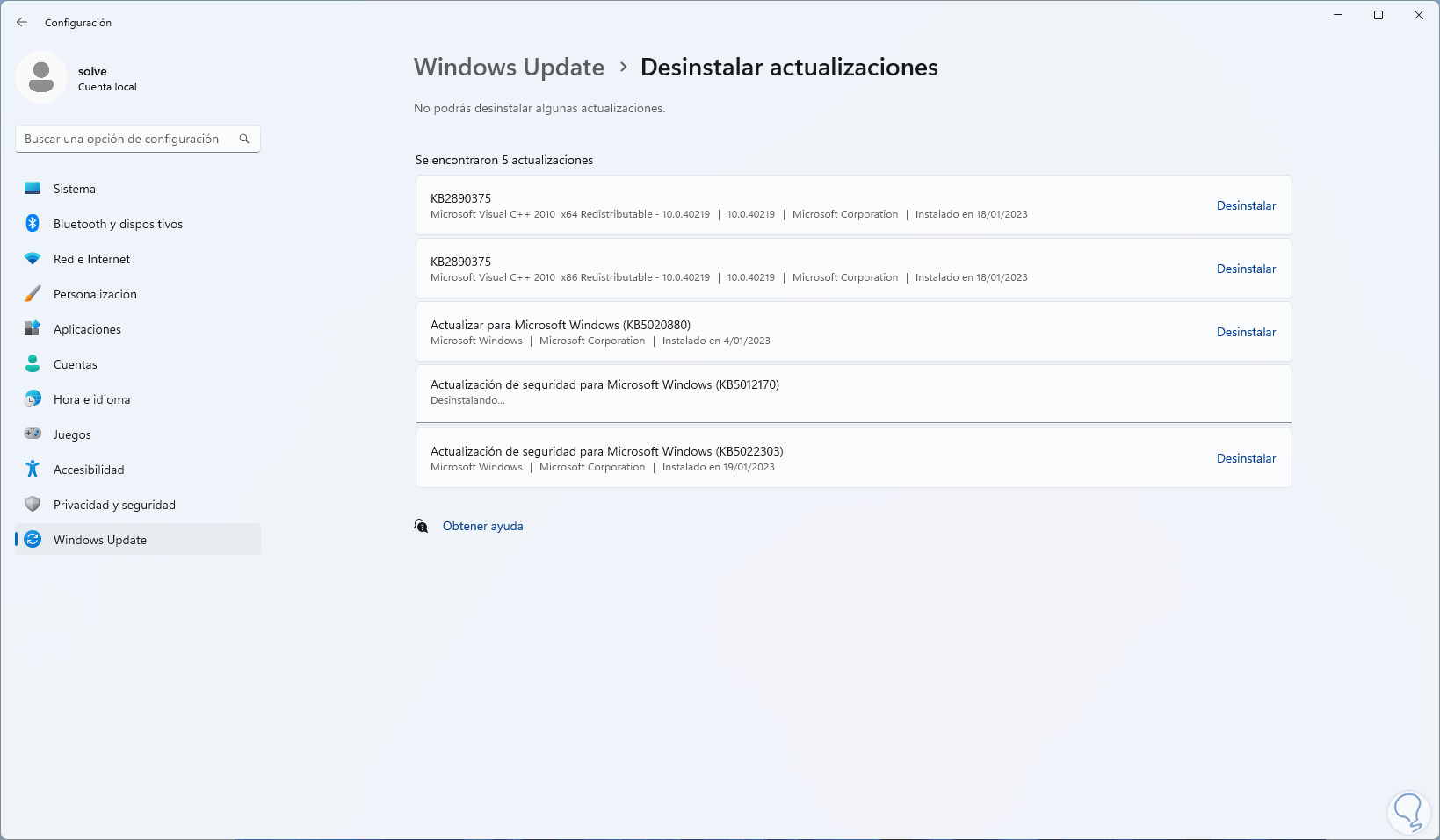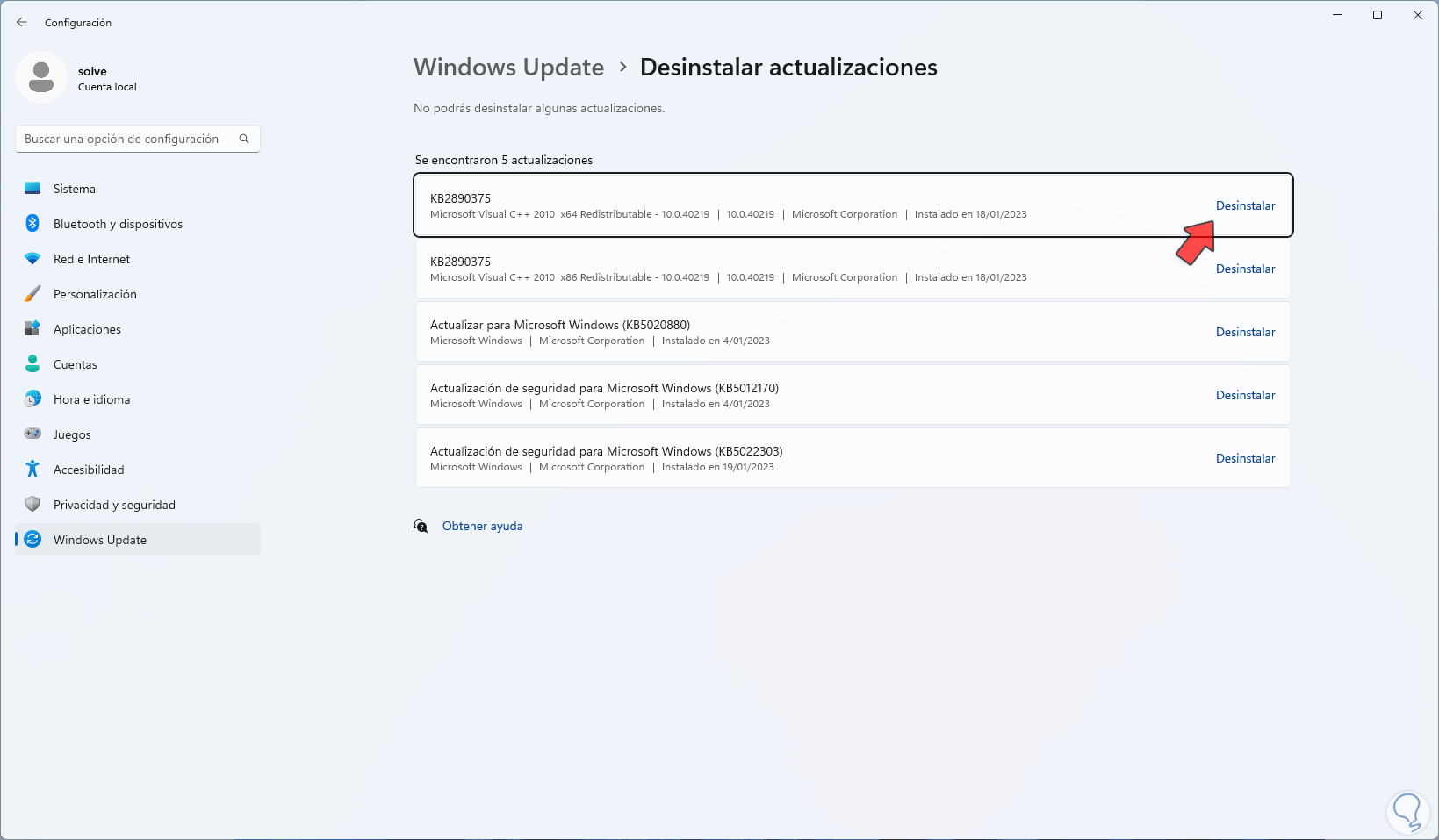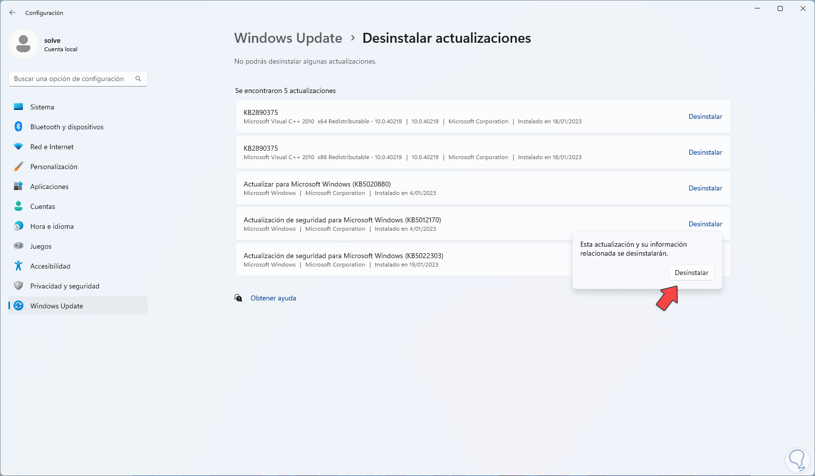 Ubica la actualización que genera error y da clic en "Desinstalar".