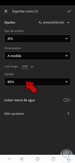 Continuamos configurando nuestra imagen trabajando la “Calidad” con la que exportaremos. Por la experiencia de los usuarios dentro de Instagram, una calidad adecuada para evitar recortes de calidad sería establecer un porcentaje cercano al 80%. Por ello pulsaremos en el desplegable y elegimos ese valor.