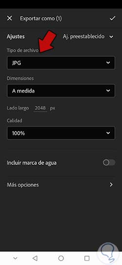 Aquí vamos a poder dar las primeras configuraciones para nuestra fotografía. Lo primero que haremos será ajustar el “Tipo de archivo” que en este caso será JPG.