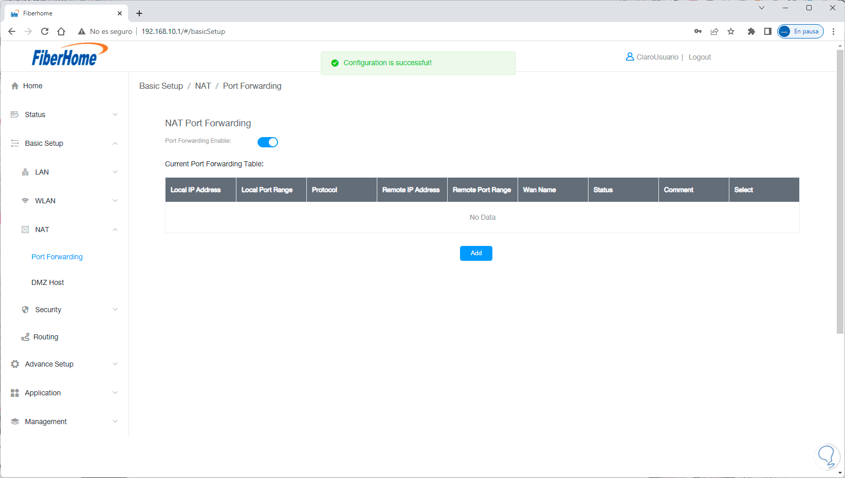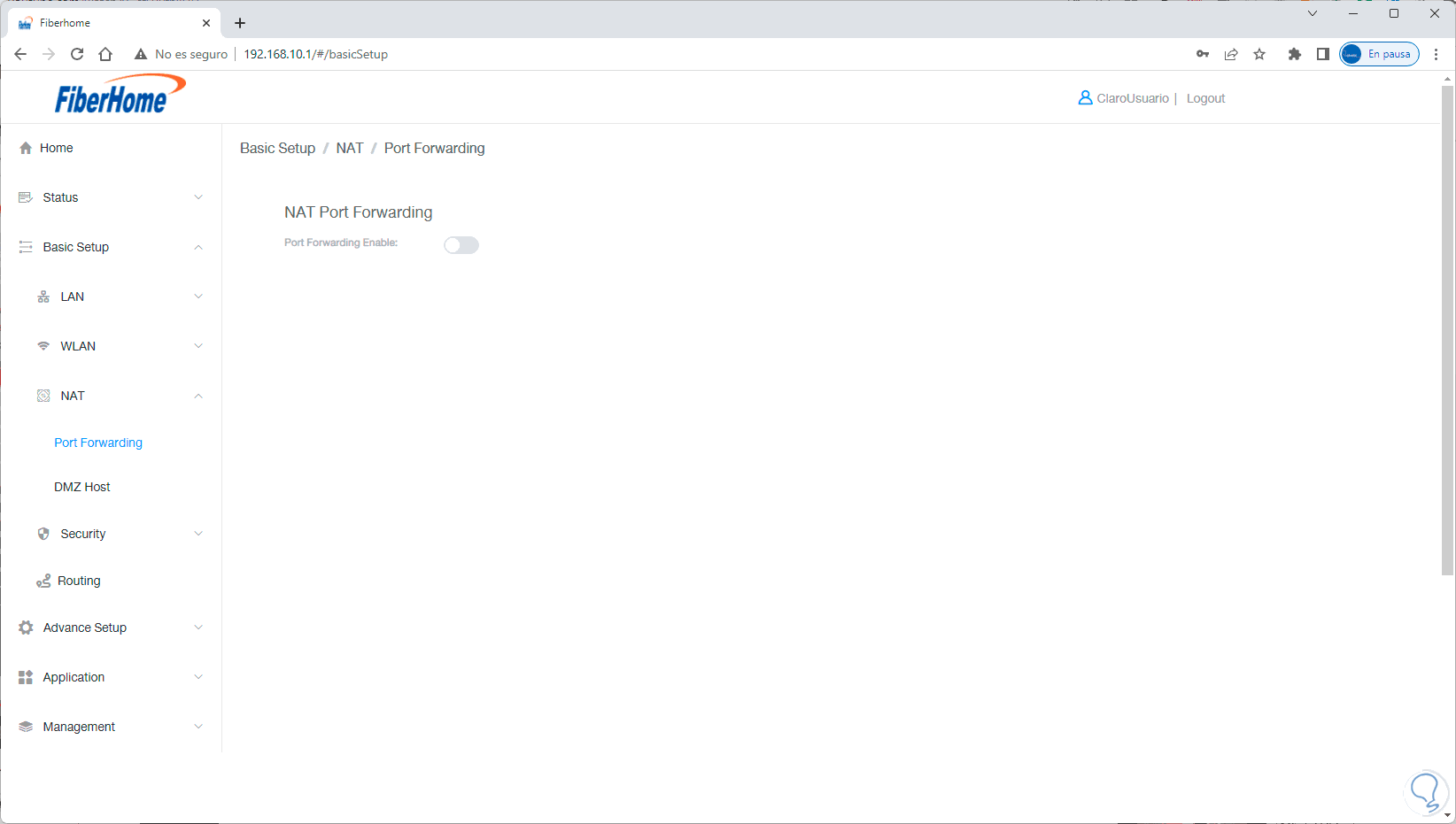 Es posible que sea necesario habilitar el acceso a través de otras redes, para ello configuraremos la opción NAT directamente en el router o modem, accedemos desde un navegador a la IP de la puerta de enlace e ingresamos las credenciales, iremos a la sección NAT y ubicamos “Port Forwading”: