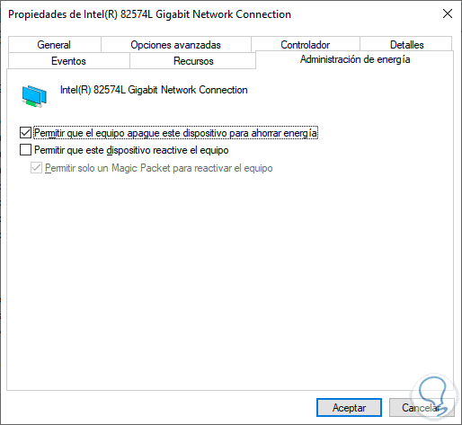 En la ventana emergente vamos a la pestaña "Administración de energía" donde veremos lo siguiente: