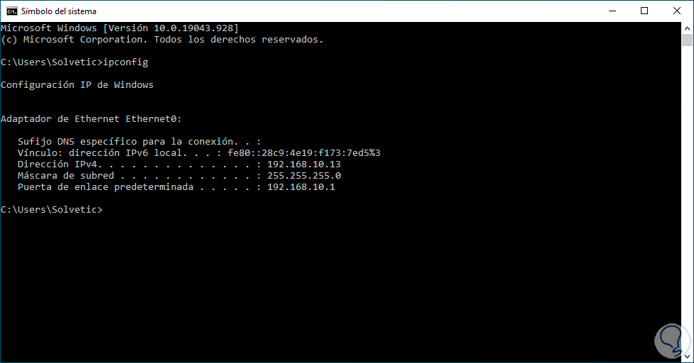 Ejecutamos "ipconfig" para saber la IP del PC: