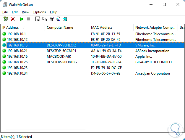 Allí encontramos el PC con Windows 10 que iremos a activar a través de Wake on Lan, damos clic derecho sobre el PC y seleccionamos "Wake Up Selected Computers":