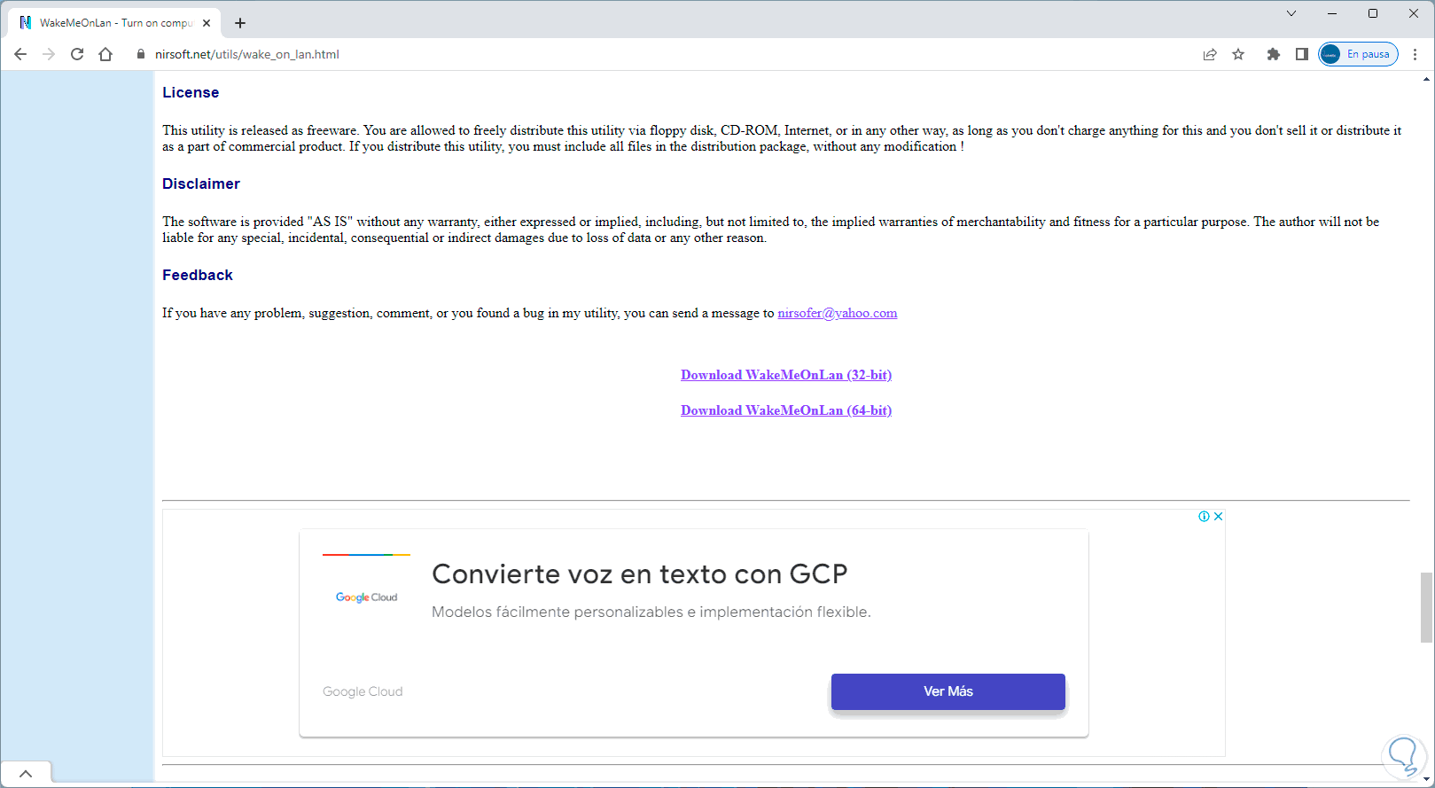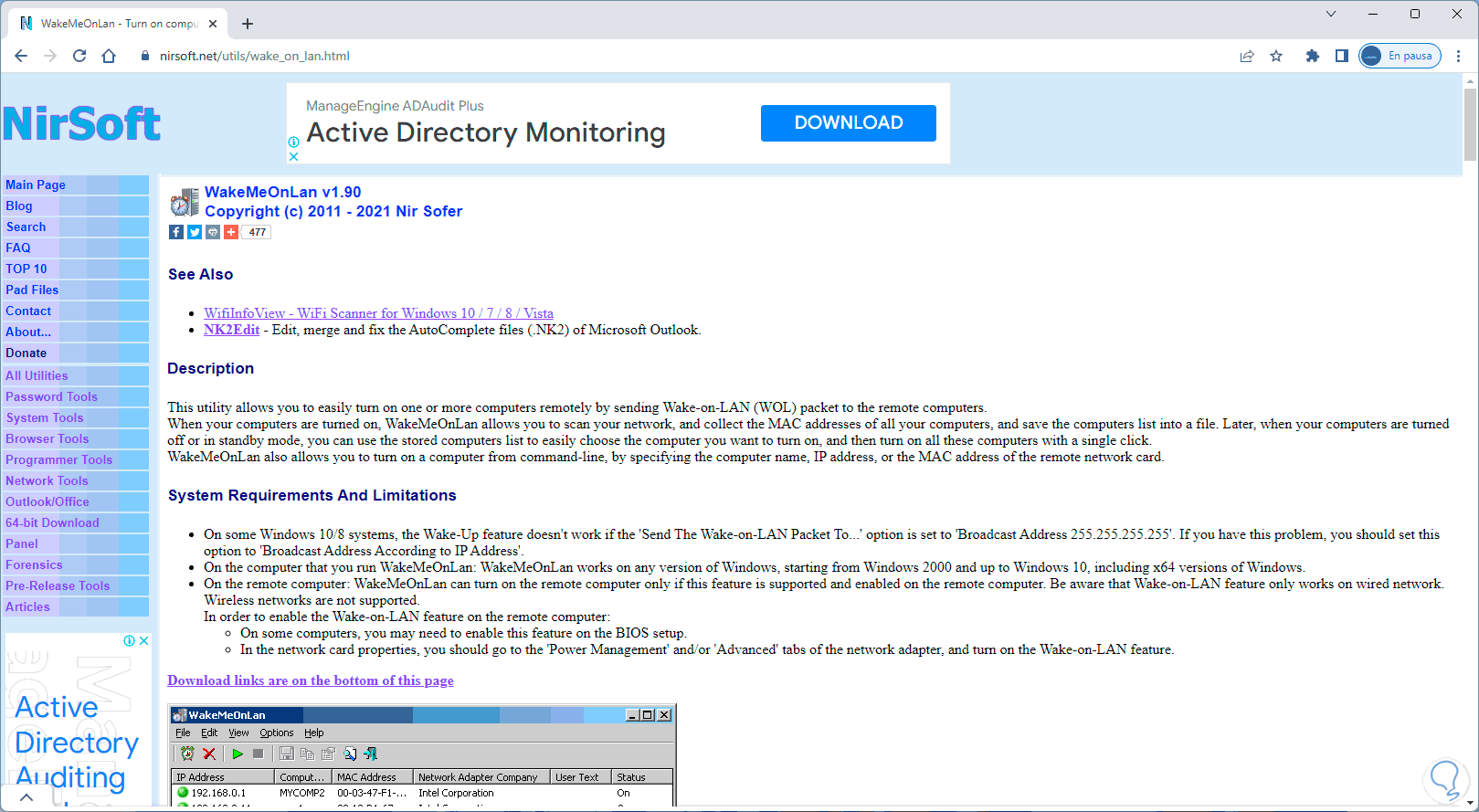 En el equipo remoto descargamos la utilidad para acceder a través de Wake On Lan, esta puede ser descargada en el siguiente enlace: