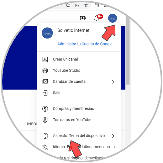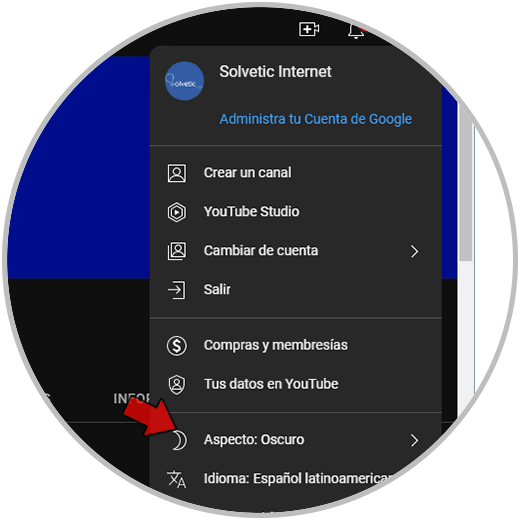 Para volver al estado normal de YouTube damos clic en el icono de perfil y luego damos clic en "Aspecto":