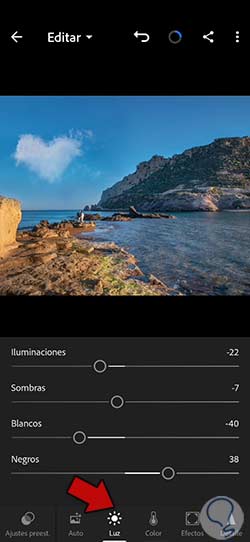 Comenzaremos mejorando la iluminación de nuestra fotografía. Para ello pulsaremos sobre el apartado de “Luz”.