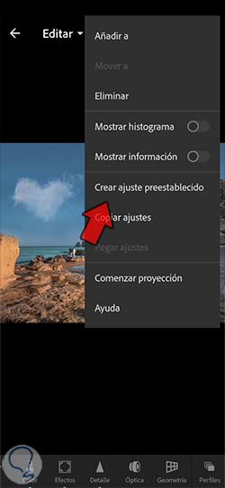 Una vez tengas estos ajustes realizados puedes crear un ajuste preestablecido que te ayuda a poder usar esos mismos ajustes en cualquier momento en todas tus imágenes. Para ello puedes pulsar sobre los tres puntos superiores de tu fotografía