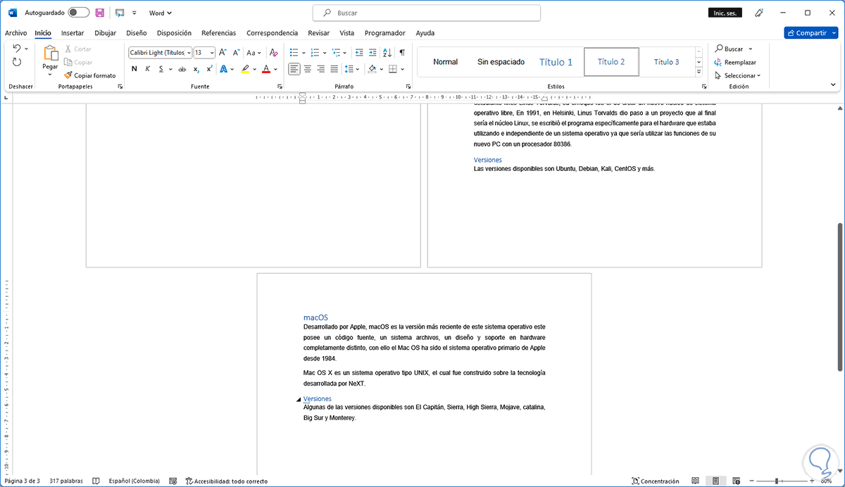 Automáticamente la numeración será aplicada a los títulos y subtítulos: