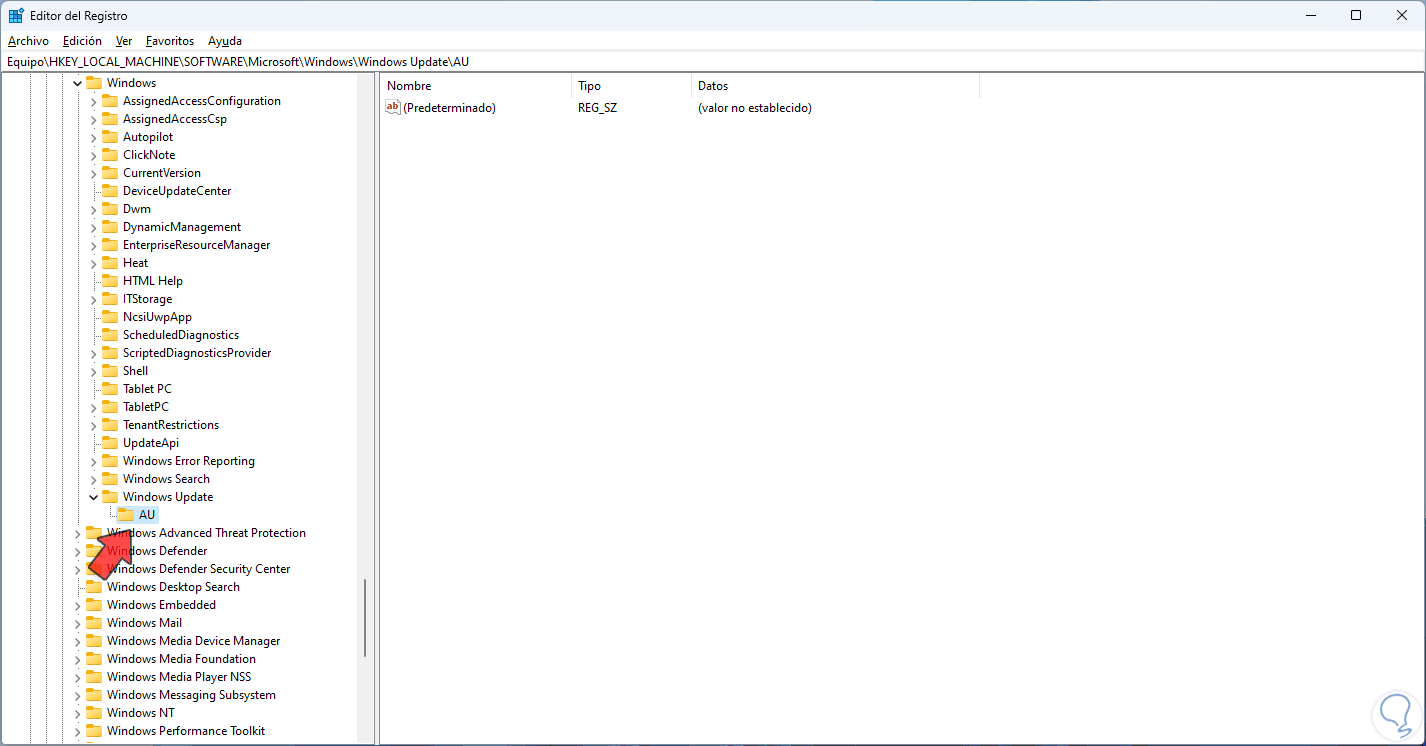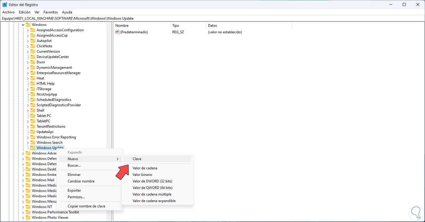 Damos clic derecho sobre "Windows Update" y seleccionamos "Nuevo - Clave":