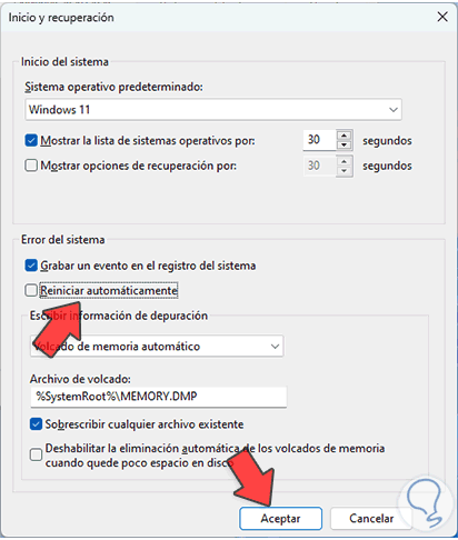 Con este caso buscamos configurar la opción de volcado de memoria el cual se da cuando sucede un error local en Windows, se escriben los datos del error en el archivo de volcado y de forma automática se da la orden de reinicio de Windows 11.