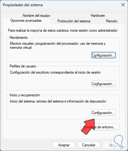 Para configurar esto en el buscador de Inicio ingresamos "configuración avanzada del sistema" y damos clic en "Ver la configuración avanzada del sistema":