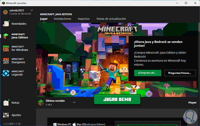 Abrimos de nuevo el Launcher e inicia sesión con la nueva cuenta, se abrirá lo siguiente: