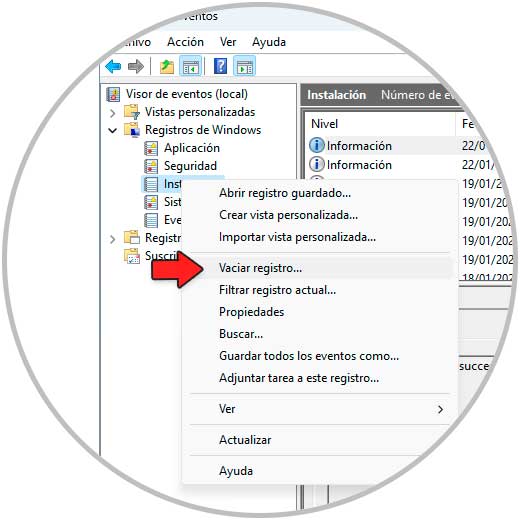 Damos clic derecho sobre "Instalación" y seleccionamos la opción "Vaciar registro":