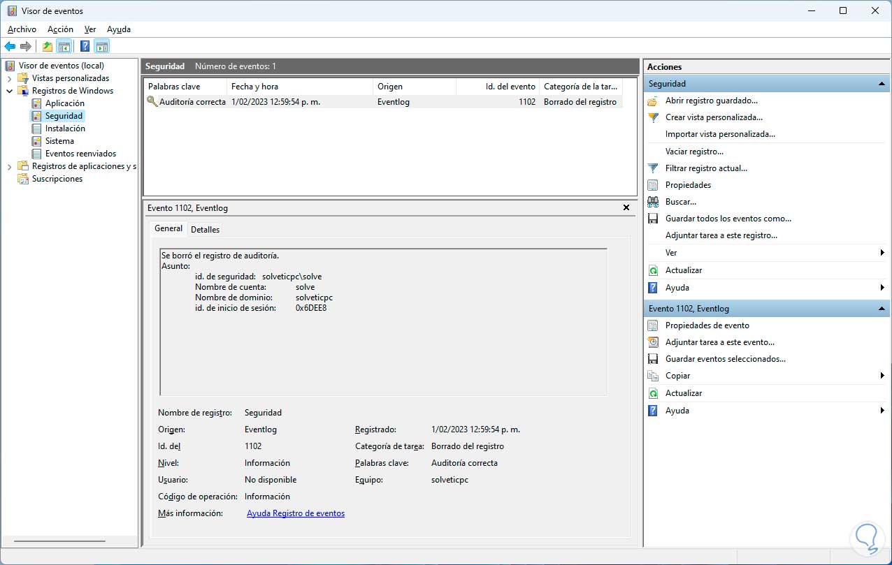 Damos clic derecho sobre "Seguridad" y seleccionamos la opción "Vaciar registro":
