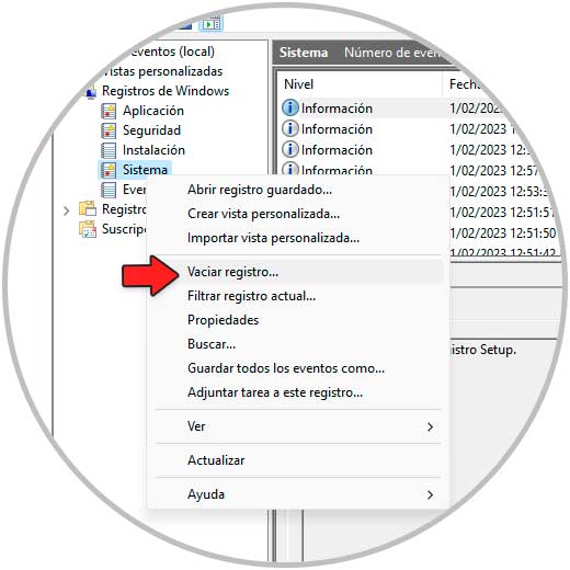 Ahora damos clic derecho sobre "Sistema" y seleccionamos la opción "Vaciar registro":