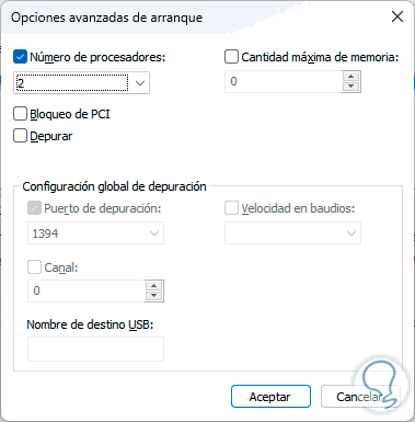 Activamos la casilla "Número de procesadores" y seleccionamos los procesadores disponibles en base al CPU físico del equipo: