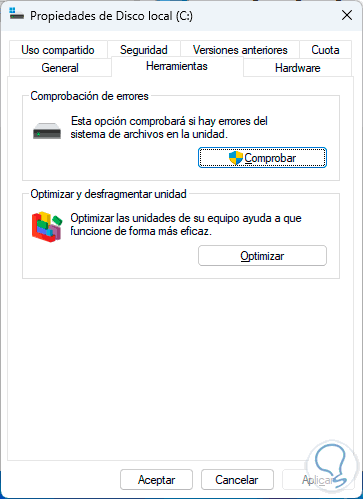 Finalmente podemos recurrir a la opción para optimizar el disco duro pero esta es una función que solo esta disponible para los discos duros mecánicos o HDD y no aplica para los discos duros de estado solido SDD (debido a sus atributos de seguridad y rendimiento).
