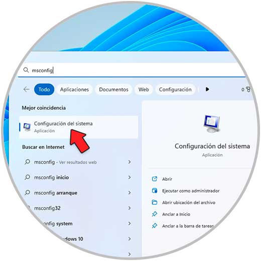 En el buscador de Inicio ingresamos "msconfig" y ejecutamos la utilidad: