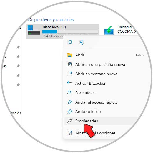 Para este caso abrimos el Explorador de archivos y damos clic derecho en la unidad C para seleccionar "Propiedades":