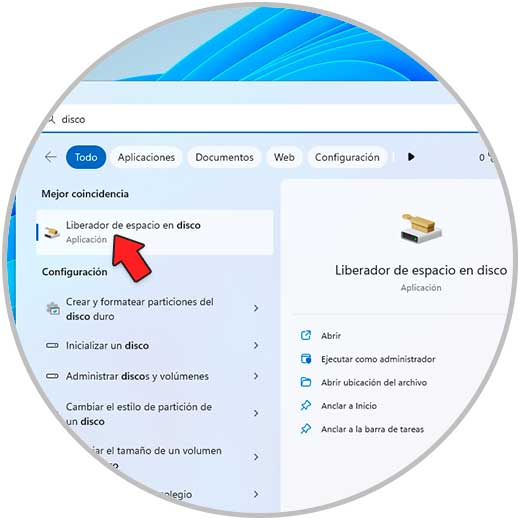 Validamos que esté la opción "Liberar espacio", si no es así, en el buscador de Inicio ingresamos "disco":