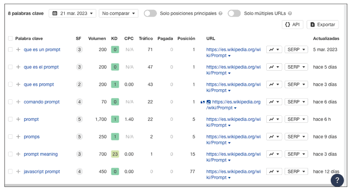 Si pulsas sobre palabras clave, verás las palabras clave por las que está posicionando ese enlace dentro del contenido desde el que han enlazado tu site. Esto puede darte ideas para crear nuevo contenido relacionado.