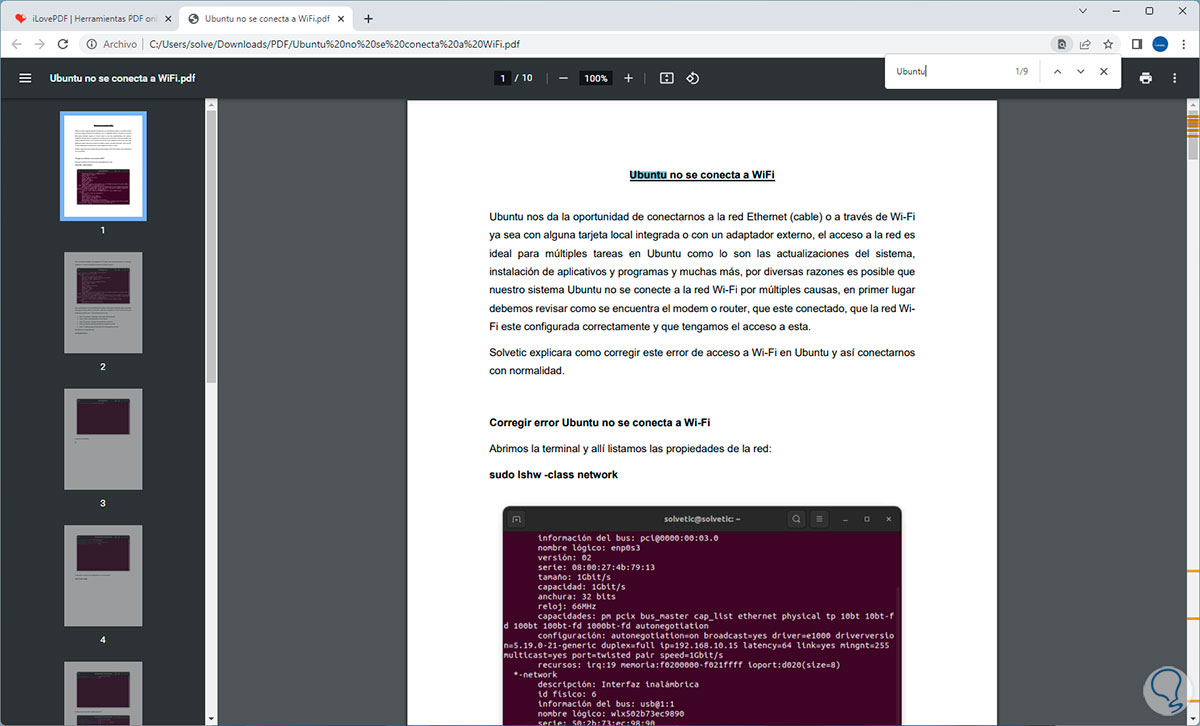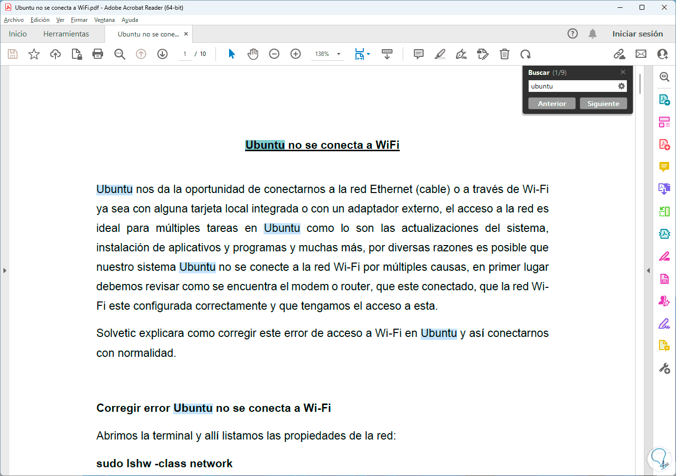 Veremos las coincidencias encontradas y en el PDF estarán resaltadas cada una de ellas a medida que vamos dando clic en las flechas de arriba/abajo: