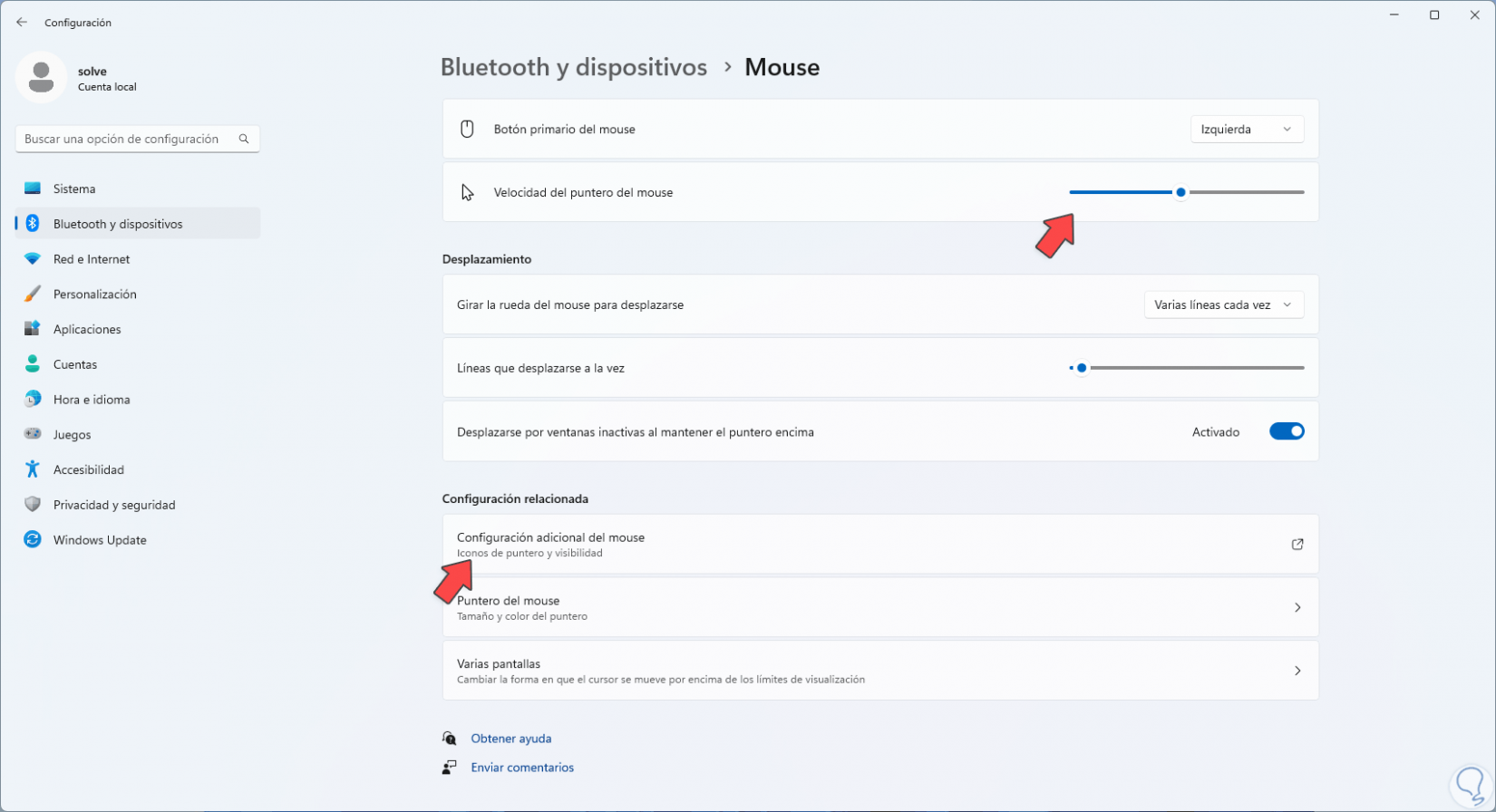 Al acceder allí veremos lo siguiente. Ajustamos el DPI usando la barra deslizante en "Velocidad del puntero del mouse". Después daremos clic en "Configuración adicional del mouse"