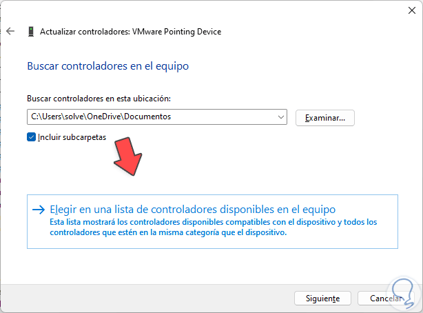 Pulsa Enter y luego con la tecla Tab selecciona "Elegir en una lista de controladores en el equipo":