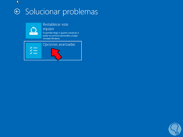 Con la flecha abajo + Enter vamos a “Solucionar problemas”, luego pulsamos Enter sobre “Opciones avanzadas”: