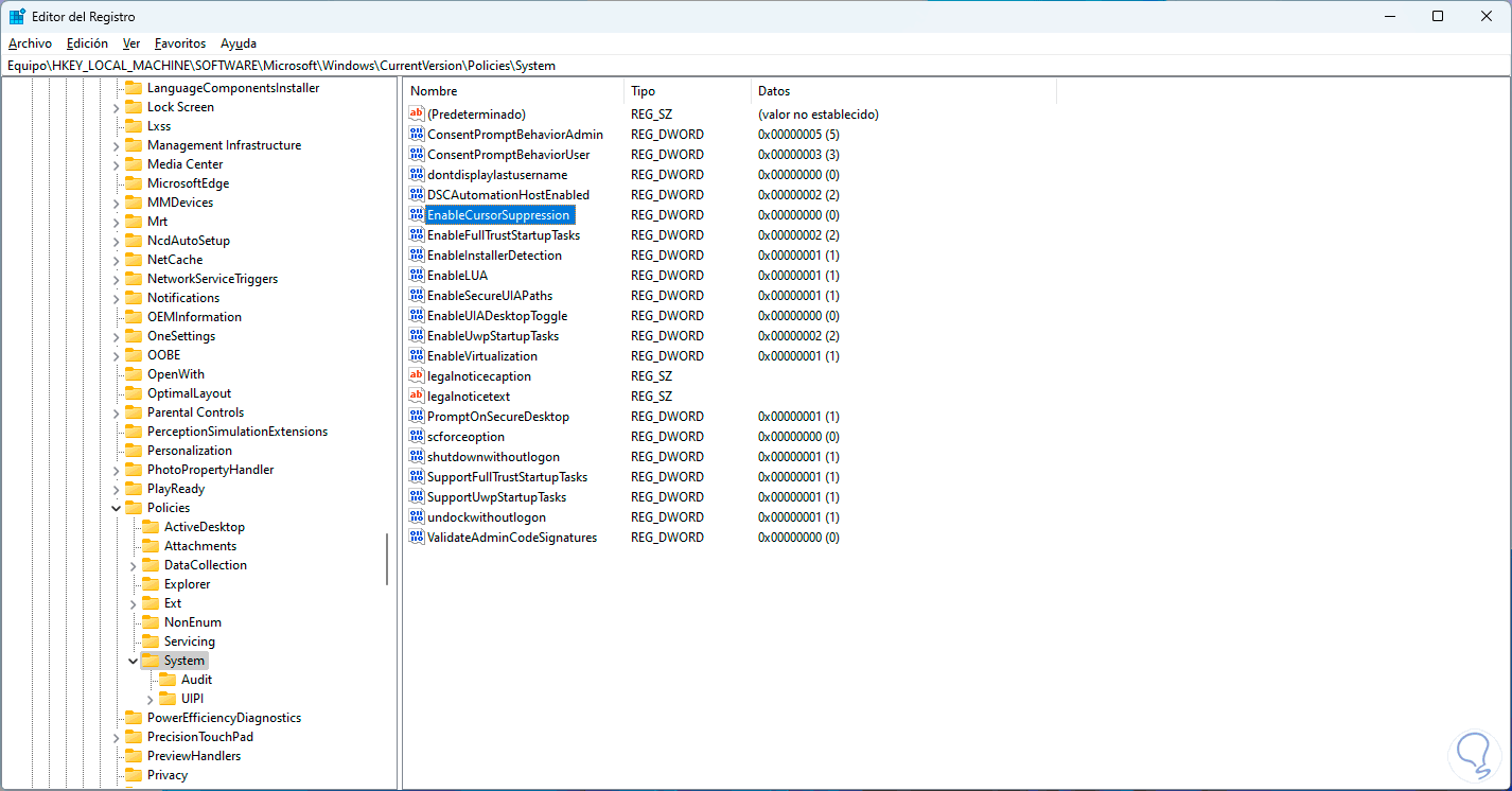 Con la tecla Tab accedemos al panel central y usando la flecha abajo selecciona el valor "EnableCursorSuppression", pulsamos Enter sobre el valor para ver sus propiedades: