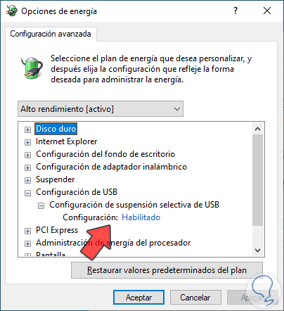 Este paso es esencial ya que el plan de energía se encarga de administrar diversos elementos del sistema en base al plan seleccionado, pero dentro de estas opciones también encontramos una especial que administra los medios USB y puede ser la causa de nuestros errores.