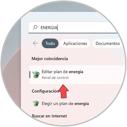 En el buscador de Inicio ingresamos "energía" y allí damos clic en "Editar plan de energía":