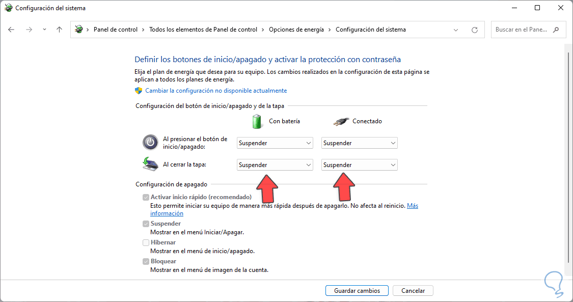 Damos clic en "Elegir la acción del cierre de la tapa" en "Opciones de energía" para ver lo siguiente: