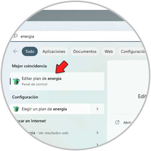Para esto en el buscador de inicio ingresamos "energía" y damos clic en "Elegir un plan de energía":