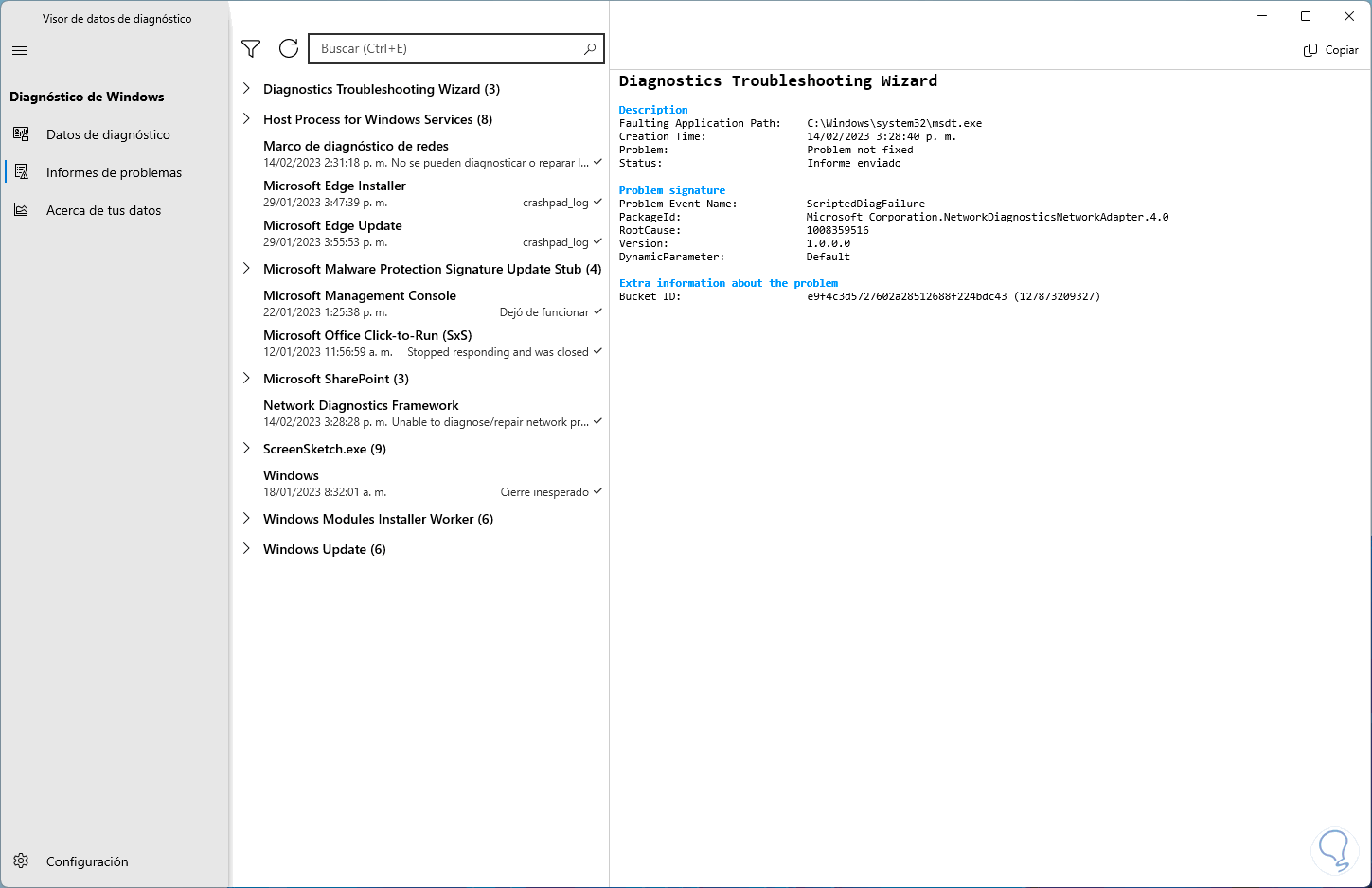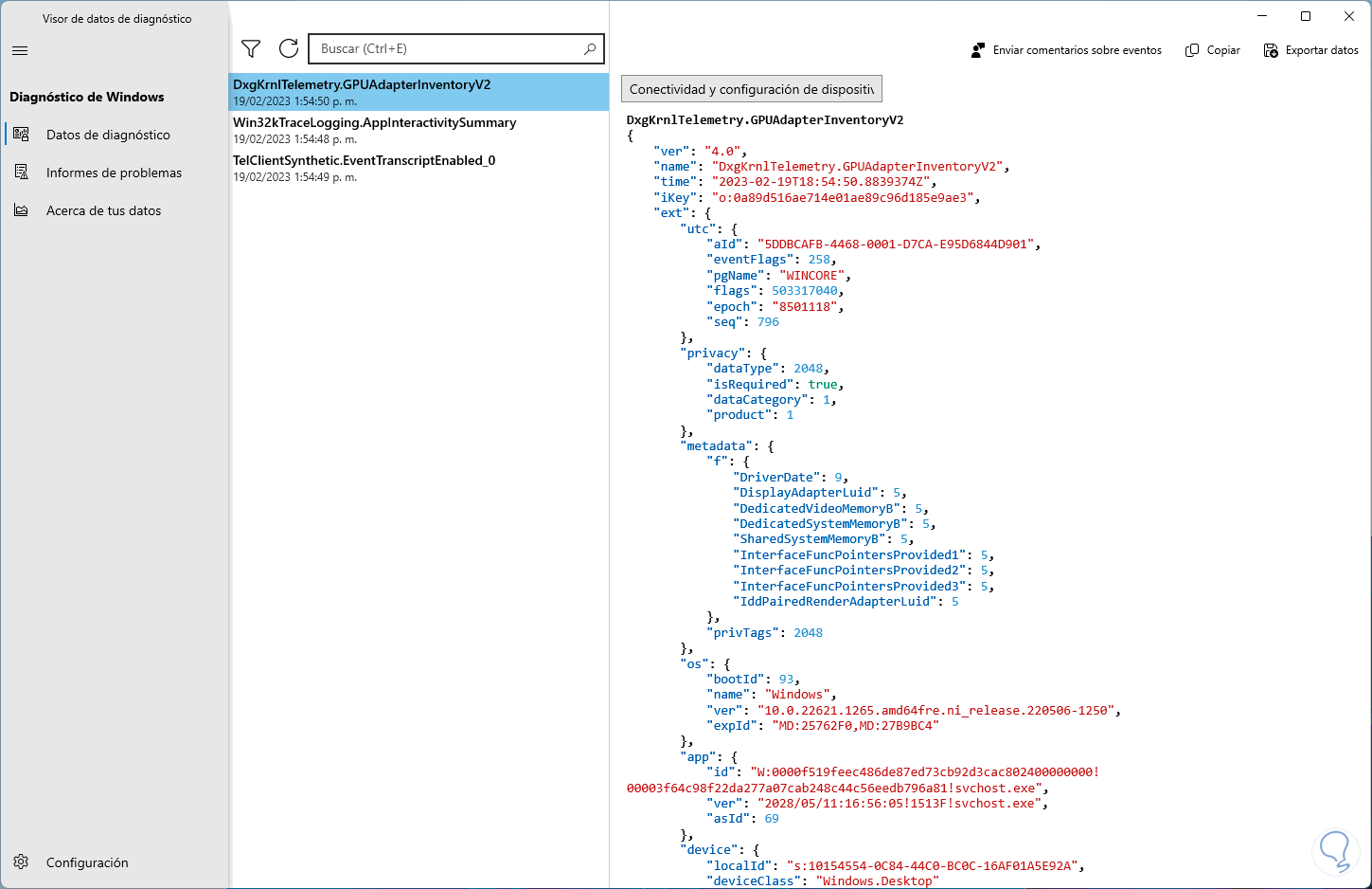 Damos clic en "Abrir Visor de datos de diagnóstico" y esta vez se abrirá la utilidad: