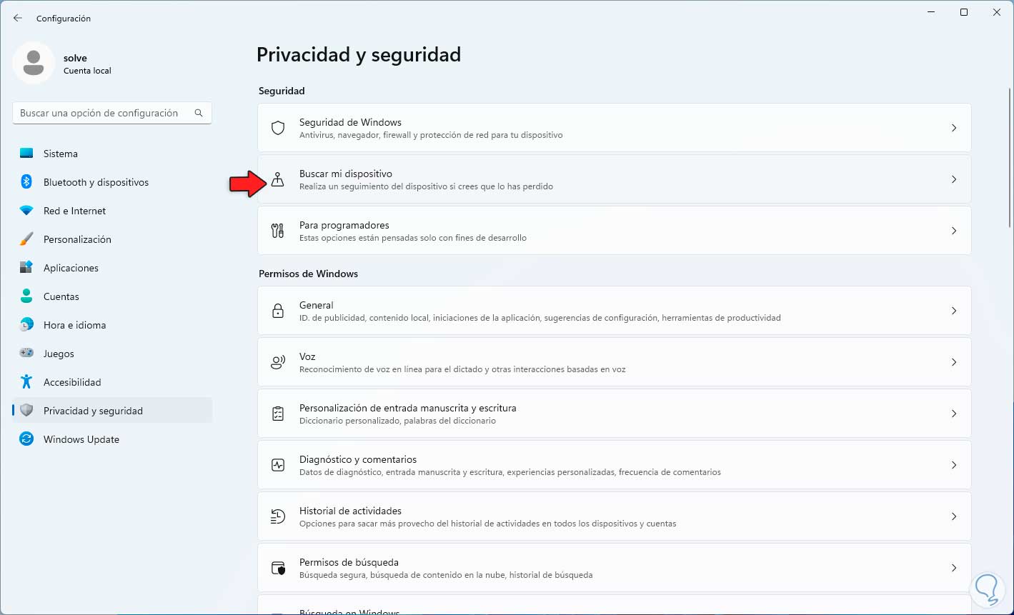 Vamos a "Privacidad y seguridad" y ahora damos clic en "Buscar mi dispositivo":