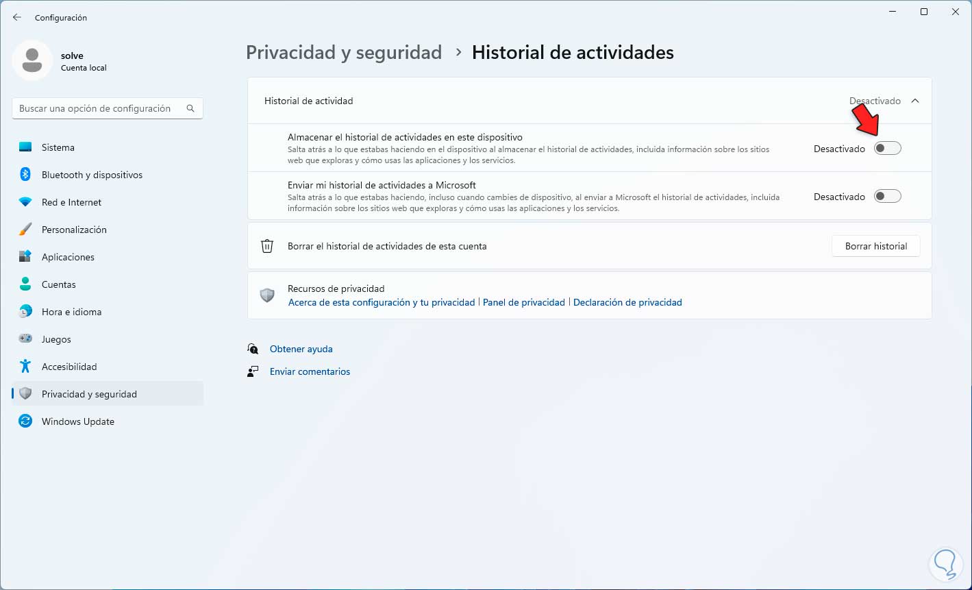 Desactivamos el interruptor "Almacenar el historial de actividades en este dispositivo":