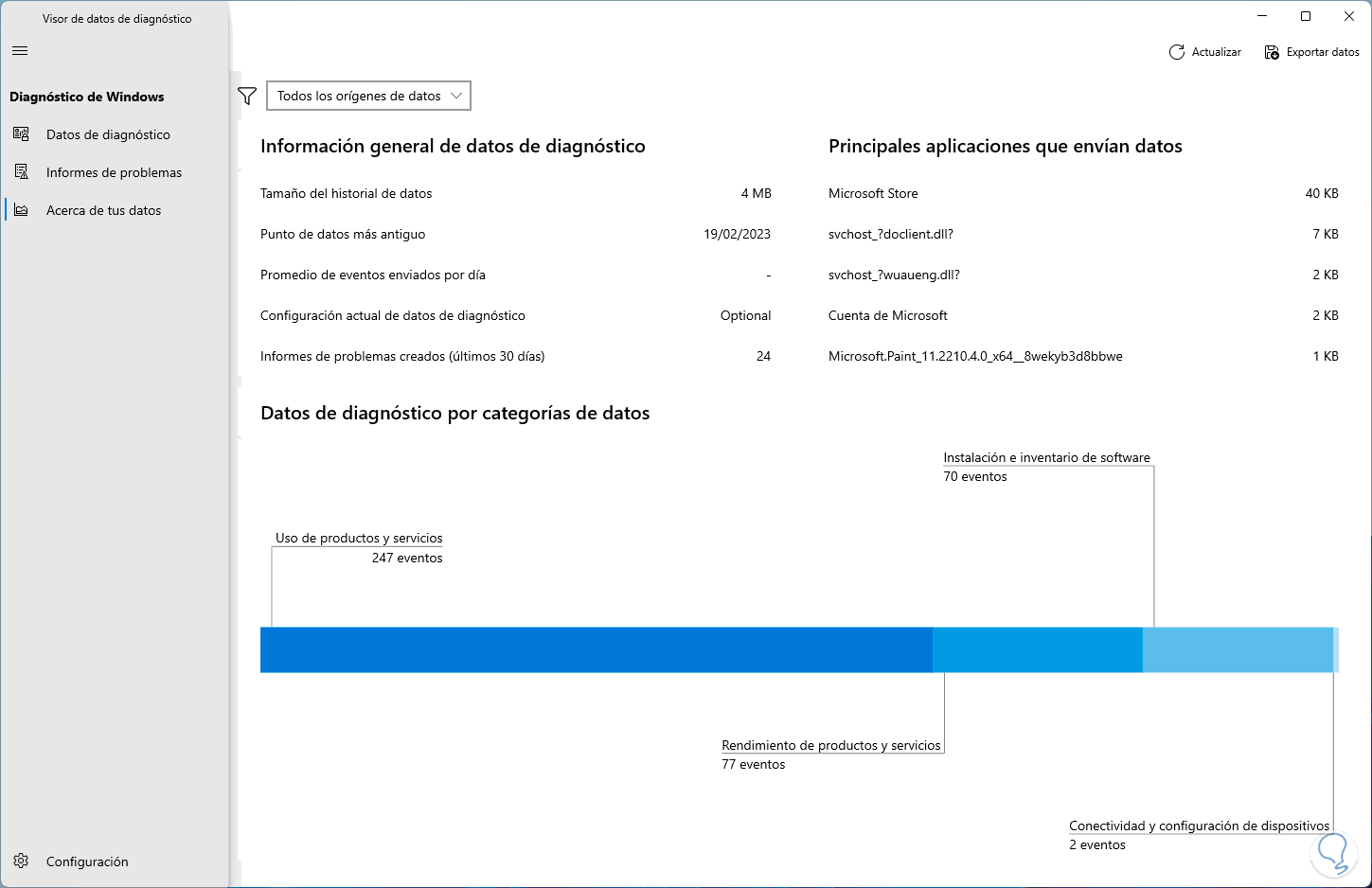Una vez instalada, vamos de nuevo a "Diagnóstico y comentarios" y damos clic en "Ver los datos de diagnóstico":