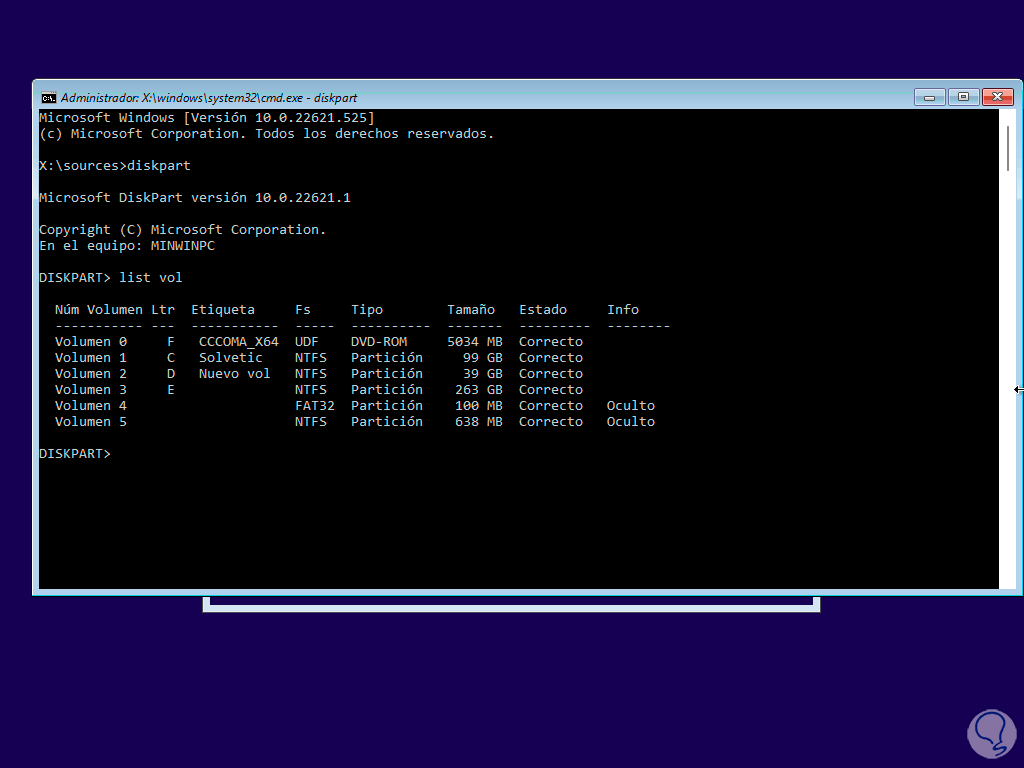 En la pantalla de inicio pulsa las teclas Shift + F10 para acceder a la consola, allí ejecutamos la utilidad "diskpart" y listamos los volúmenes: