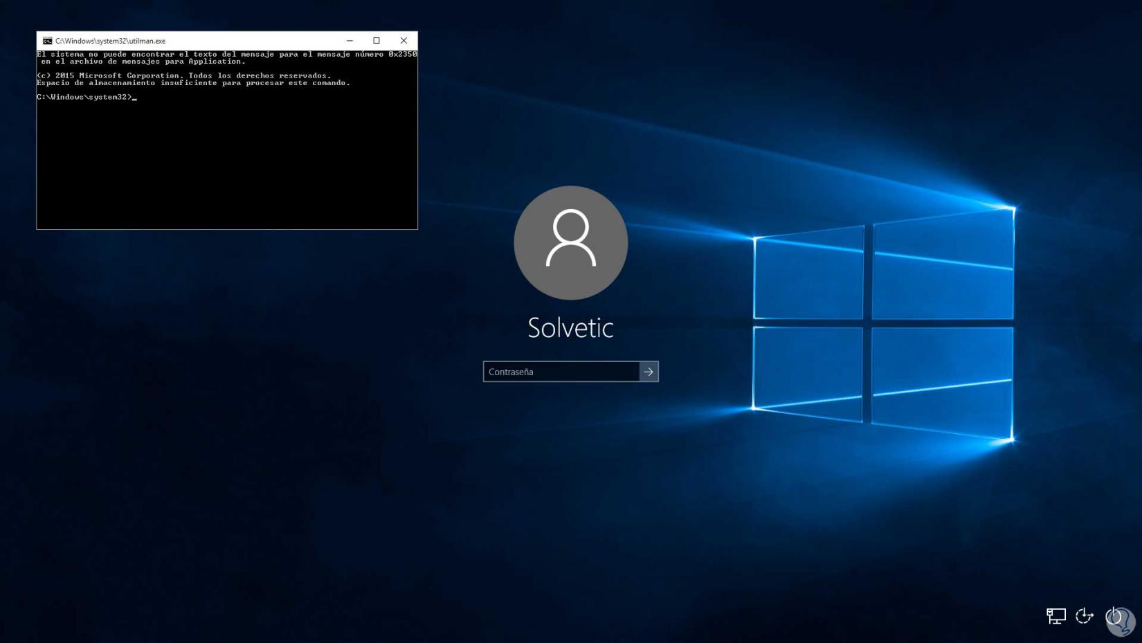En la pantalla de inicio de sesión damos clic en el icono de accesibilidad ubicado en la parte inferior y se abrirá la consola de CMD: